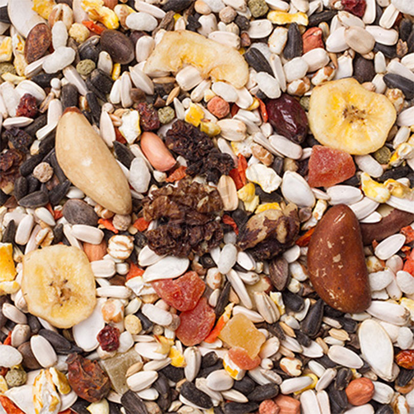 Composition: Black sunflower seed, large striped sunflower seed, white sunflower seed, safflower, white sorghum, buckwheat, puffed maize, pumpkin seed, cedar nuts, Brazil nuts, wheat, puffed wheat, extruded pellets, peeled peanuts, grit, rosehips, paddy rice, peeled oats, carrot pieces, walnuts, milk thistle, mountain-ash berries, banana slices, pineapple, papaya, chilli peppers.